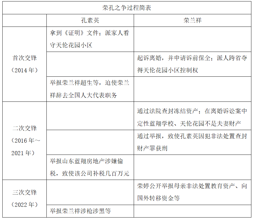 2014年以來,由離婚案引發(fā)的“榮孔大戰(zhàn)”,上演了多重戲碼,波及范圍以榮蘭祥、孔素英兩夫妻為圓心,輻射至6個兒女、雙方家族親戚,以及藍(lán)翔學(xué)校的學(xué)生、商丘天倫花園百余名購房者等。