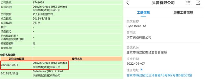 同日,燃財(cái)經(jīng)查詢香港公司注冊(cè)處網(wǎng)上查冊(cè)中心,發(fā)現(xiàn)上述更名公司成立時(shí)間為2012年5月8日。經(jīng)核實(shí),字節(jié)跳動(dòng)雖不存在成立新公司的事實(shí),但是公司名稱更改卻為真,且并非孤例。天眼查數(shù)據(jù)顯示,字節(jié)跳動(dòng)集團(tuán)的主公司已由原先的“字節(jié)跳動(dòng)有限公司”更名為“抖音有限公司”,核準(zhǔn)日期顯示為2022年5月7日。