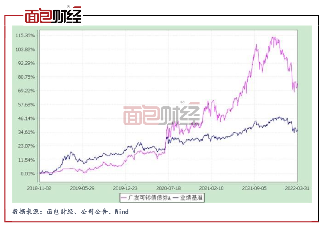 受此影響,基金單位凈值一季度快速下跌,直到3月底下跌趨勢才有所放緩。截至2022年5月6日,廣發(fā)可轉(zhuǎn)債債券A的單位凈值跌至1.7元,年內(nèi)虧損超過21%,跑輸基準(zhǔn)約12個(gè)百分點(diǎn),在樣本基金中回撤第一。