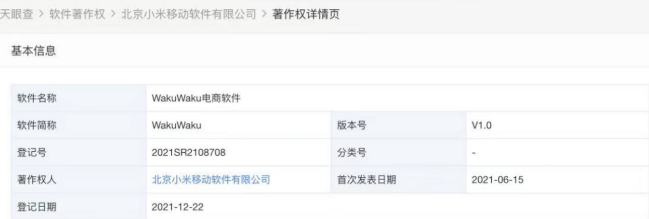 據(jù)企查查著作權(quán)一列披露,2021年6月15日“WakuWaku電商軟件”的著作權(quán)被首次發(fā)表,2021年12月22日,北京小米移動(dòng)軟件有限公司對(duì)“WakuWaku電商軟件”進(jìn)行了著作權(quán)登記。