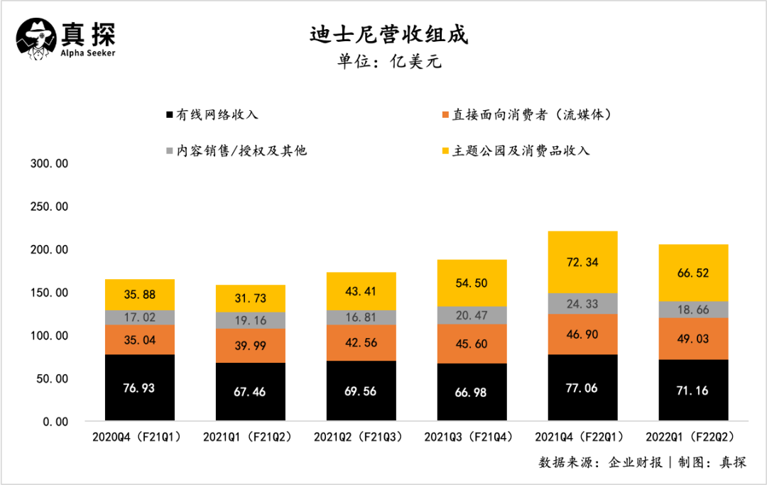 迪士尼的業(yè)務(wù)結(jié)構(gòu)主要包含四大塊:有線(xiàn)網(wǎng)絡(luò)、直接面向消費(fèi)者(Disney+、Hulu、ESPN+)、內(nèi)容銷(xiāo)售授權(quán)業(yè)務(wù)以及主題公園收入。