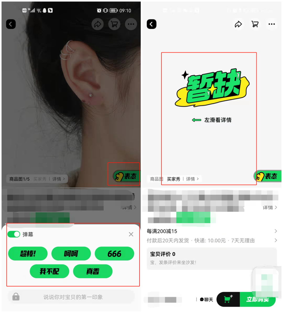 而用戶則可以在商品微詳情頁里通過“表態(tài)”按鈕,發(fā)布“超棒” “呵呵” “真香”等彈幕,表達(dá)自己對商品的態(tài)度。但部分產(chǎn)品還存在“買家秀”暫缺的情況。