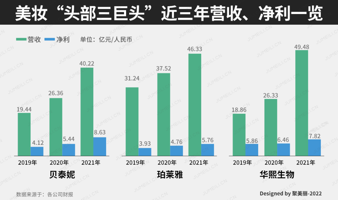 最新年報(bào)顯示,貝泰妮、珀萊雅、華熙生物這三家上市公司不僅錄得營(yíng)收與利潤(rùn)的三連漲,其2021年度營(yíng)收都超過(guò)了40億元,市值也穩(wěn)居行業(yè)前三。甚至在最新發(fā)布一季報(bào)上,“三巨頭”也同樣在2022年初增長(zhǎng)強(qiáng)勁,令人矚目。