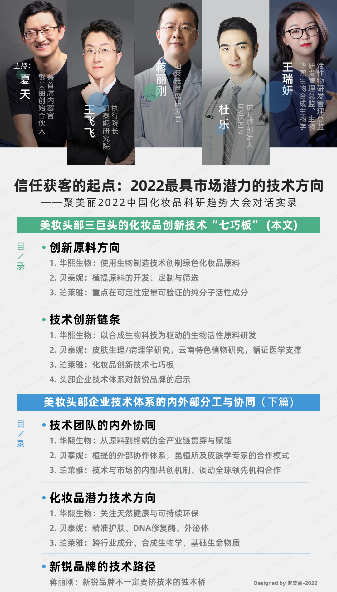 基于以上思考,在5月10日召開(kāi)的2022中國(guó)化妝品科研趨勢(shì)大會(huì)上,聚美麗邀請(qǐng)了這三家企業(yè)的技術(shù)帶頭人,同時(shí)邀請(qǐng)了新銳品牌創(chuàng)始人代表,就上述課題展開(kāi)了一場(chǎng)題為《信任獲客的起點(diǎn):2022最具市場(chǎng)潛力的技術(shù)方向》的深度對(duì)話。