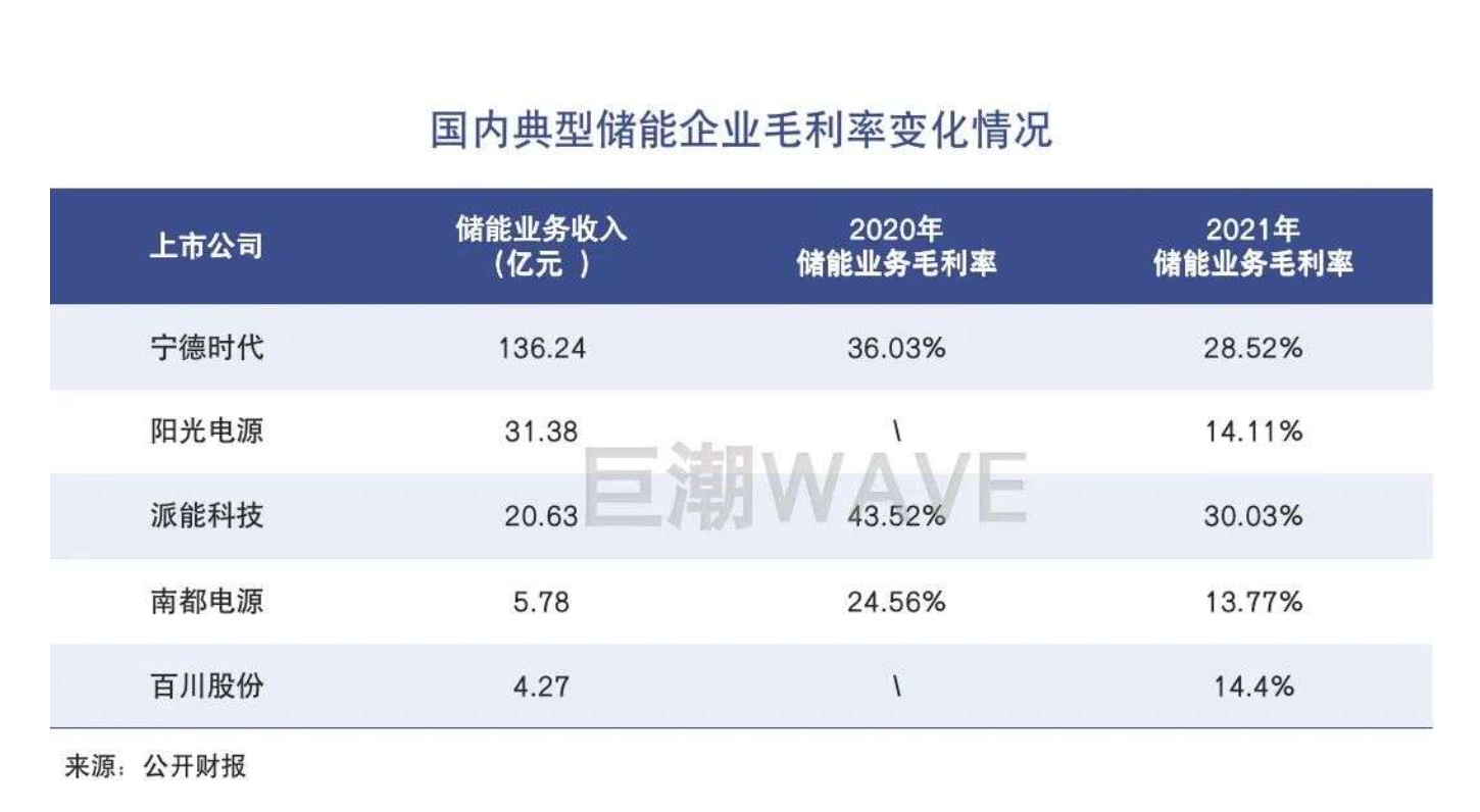 可以看到,具備鋰電池生產(chǎn)能力的儲能企業(yè),比如寧德時代、派能科技、鵬輝能源、南都電源等,直接受到上游原材料漲價的影響,去年的毛利率普遍出現(xiàn)下滑。