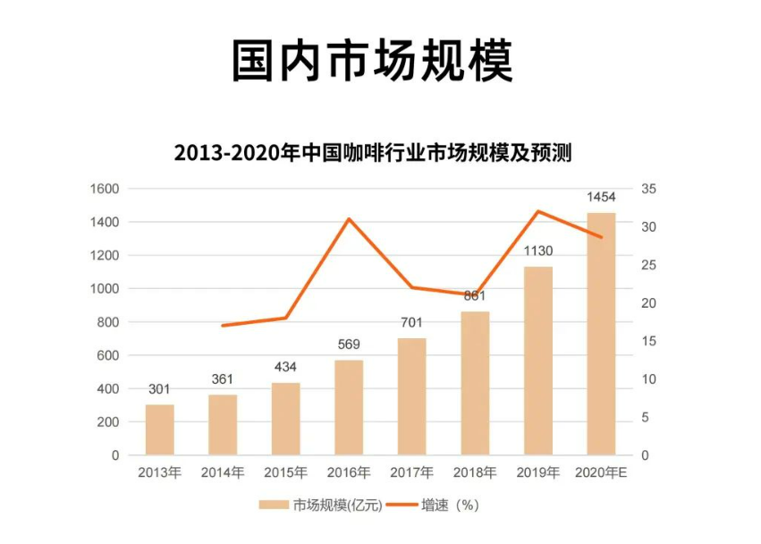 據(jù)《2021中國咖啡行業(yè)發(fā)展白皮書》數(shù)據(jù)顯示,2019年我國咖啡市場規(guī)模達到了1130億元,同比增長了31.24%,2020年行業(yè)規(guī)模則擴大到了1454億元左右。平均下來,2020年我國大陸地區(qū)人均咖啡消費量僅為每年9杯,日本的這一數(shù)據(jù)為280杯,美國為329杯,韓國為367杯。從人均消費量來看,國內(nèi)咖啡市場仍有較大的增長空間。