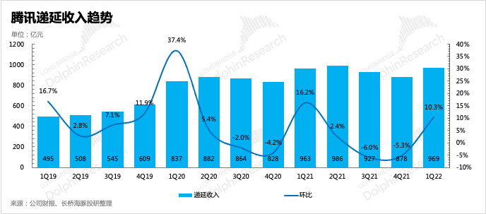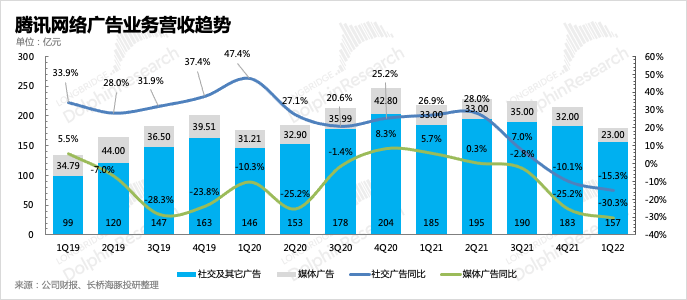 (3)廣告:超出預(yù)期的“艱難”一季度廣告情況比市場(chǎng)原本預(yù)想的還要更糟糕,同比下滑近18%。除了自去年下半年以來(lái)一直有的監(jiān)管、經(jīng)濟(jì)環(huán)境影響,還與年初以來(lái)全國(guó)各地一二線(xiàn)城市輪番封控有關(guān)。尤其是3月的上海疫情,市場(chǎng)一致預(yù)期也難以快速調(diào)整。由于疫情封控的影響還在持續(xù),若沒(méi)有對(duì)消費(fèi)端進(jìn)行高強(qiáng)度的政策刺激,海豚君預(yù)計(jì)廣告的復(fù)蘇只能等到明年了。