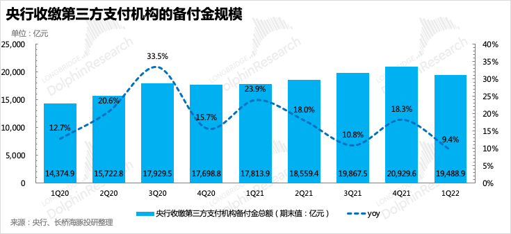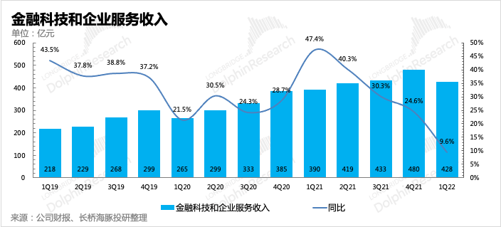 作為去年表現(xiàn)一直相對(duì)較穩(wěn)的金融科技與企業(yè)服務(wù),一季度由于疫情封控下,餐飲、外賣(mài)活動(dòng)迅速減少,商業(yè)支付業(yè)務(wù)也受到不小的影響,從第三方支付機(jī)構(gòu)上繳給央行的備付金規(guī)模也可以看出。另外,騰訊云業(yè)務(wù)在整體娛樂(lè)、互聯(lián)網(wǎng)行業(yè)寒冬下,預(yù)計(jì)項(xiàng)目拓展受到了明顯阻礙,由往昔的高增速迅速換擋至同比下滑。一季度金科與云整體收入428億元,同比增長(zhǎng)10%,遠(yuǎn)低于市場(chǎng)預(yù)期的15%-20%的增速。