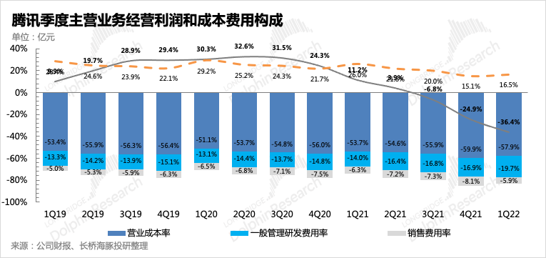 來(lái)看利潤(rùn)端,一季度騰訊主業(yè)利潤(rùn)繼續(xù)加速滑坡,雖然整體毛利率因增值服務(wù)、金科業(yè)務(wù)毛利率改善而環(huán)比略有提升(廣告因視頻號(hào)低商業(yè)化但增加了服務(wù)器成本負(fù)擔(dān)、激勵(lì)分成,毛利率繼續(xù)下滑),但費(fèi)用端并沒(méi)有體現(xiàn)出裁員傳聞后的經(jīng)營(yíng)效率提升,尤其是管理和研發(fā)費(fèi)用,同比增長(zhǎng)40%,費(fèi)率提升到過(guò)去幾年最高水平。而銷(xiāo)售費(fèi)用克制明顯,同比下滑5%,主要系與推廣及廣告費(fèi)支出顯著減少。