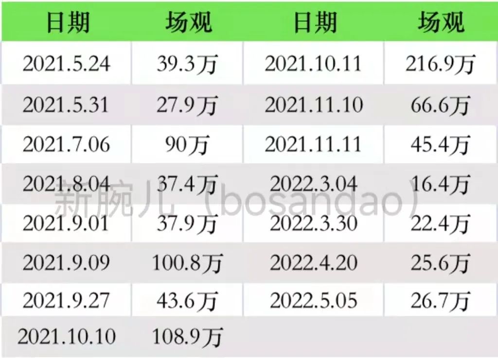 同時(shí),我們依據(jù)新腕歷史發(fā)布的主播榜單記錄的劉濤數(shù)據(jù)補(bǔ)充其首秀后至21年5月的初步數(shù)據(jù)(由于新腕僅記錄全平臺(tái)top50主播,未達(dá)到此標(biāo)準(zhǔn)數(shù)據(jù)不收錄,因此會(huì)小于真實(shí)情況)。