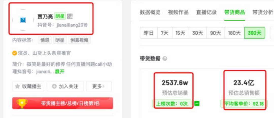 賈乃亮在2021年8月去抖音做直播帶貨。據(jù)飛瓜數(shù)據(jù)顯示,賈乃亮在最近一年內(nèi)完成51場(chǎng)直播,總GMV23.4億。按照20%傭金換算,在9個(gè)月內(nèi),賈乃亮凈賺4.68億。