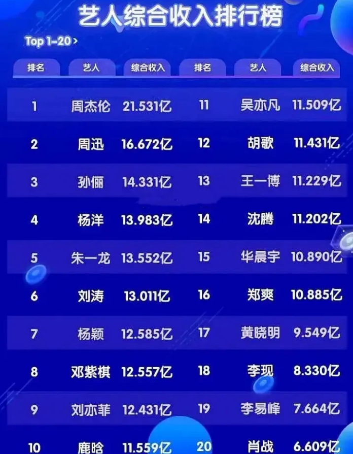網(wǎng)上公開過(guò)一份藝人2017年至2020年四年收入排行榜,排名第一的藝人周杰倫四年收入21.531億,換算年收入為5.38億。排名第二的周迅,四年收入16.672億,年收入為4.168億。和賈乃亮9個(gè)月直播帶貨收入,持平了。