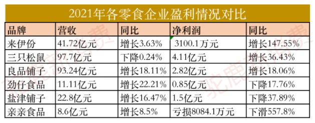截至目前,包括三只松鼠、良品鋪子、勁仔食品、鹽津鋪子、親親食品等零食企業(yè)已經盡數發(fā)完2021年財報。