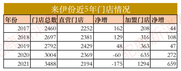 2021年財報顯示,線下方面,來伊份以加盟發(fā)展為主的“萬家燈火”計劃取得了突破,全國門店總數達3488家,同比增加484家,其中直營門店2194家,加盟門店1294家,同比增加659家,加盟占比接近40%,全年加盟簽約店數破千家,均創(chuàng)歷史新高。