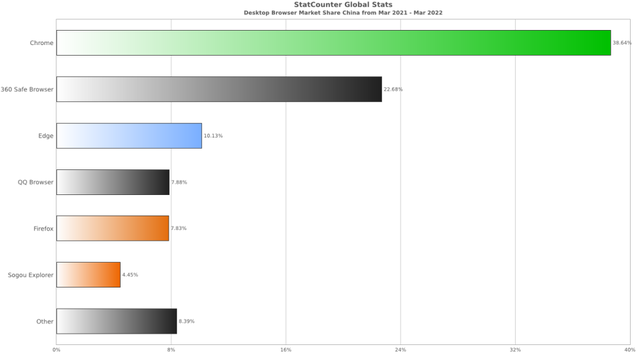 statcounter發(fā)布的數(shù)據(jù)顯示,2021年3月-2022年3月,中國電腦瀏覽器市場中,排名前三的瀏覽器分別為Chrome、360瀏覽器(包括360安全瀏覽器和360極速瀏覽器)、Edge,市場份額分別為38.64%、22.68%和10.13%。