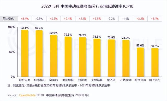 QuestMobile發(fā)布的《2022中國移動互聯(lián)網(wǎng)春季大報告》顯示,2022年3月,中國移動互聯(lián)網(wǎng)細(xì)分行業(yè)活躍滲透率TOP3分別為綜合電商、即時通訊和瀏覽器。