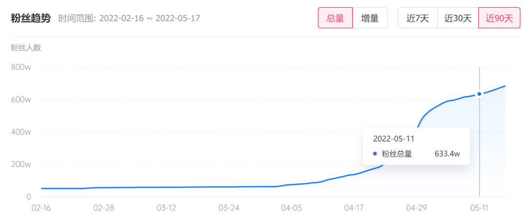 巨量星圖數(shù)據(jù)顯示,若從4月11日發(fā)布“國際超?!毕盗械谝粭l視頻算起,墊底辣孩在一個月內(nèi)的粉絲增量達到539萬,截至發(fā)稿,其粉絲量已經(jīng)突破700萬,近一周內(nèi),墊底辣孩的粉絲增長仍達到近100萬。
