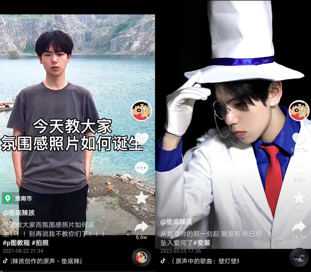 比如在前期,墊底辣孩拍的較多的是“網(wǎng)絡男神”系列和“氛圍感帥哥”系列,不過,這些內(nèi)容雖然在短期內(nèi)形成了固定的模式,但并沒有持續(xù)拍攝,而是不斷穿插其他類型的嘗試,比如教大家P圖、cosplay怪盜基德等動漫人物、還原小說中的人物形象等,整體的內(nèi)容風格并不穩(wěn)定,但核心元素都是變裝。