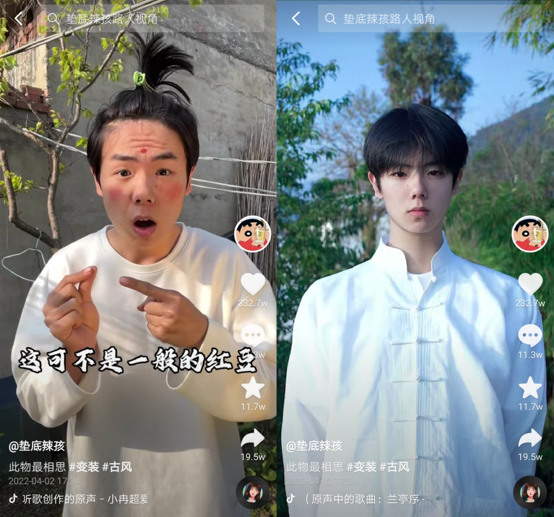 基于前期的創(chuàng)作鋪墊,4月初“紅豆配音”風靡時,墊底辣孩與之結合拍的國風變裝迎來一波大高潮,該視頻點贊量達到232萬,是其第一條點贊量破200萬的視頻。當時,墊底辣孩已經(jīng)有意在變裝前“扮丑”,拉大變裝前后的反差,以至于很多人質疑這是不是同一個人。后來“國際超?!毕盗?,承接起這一波熱度,并迅速爆火。