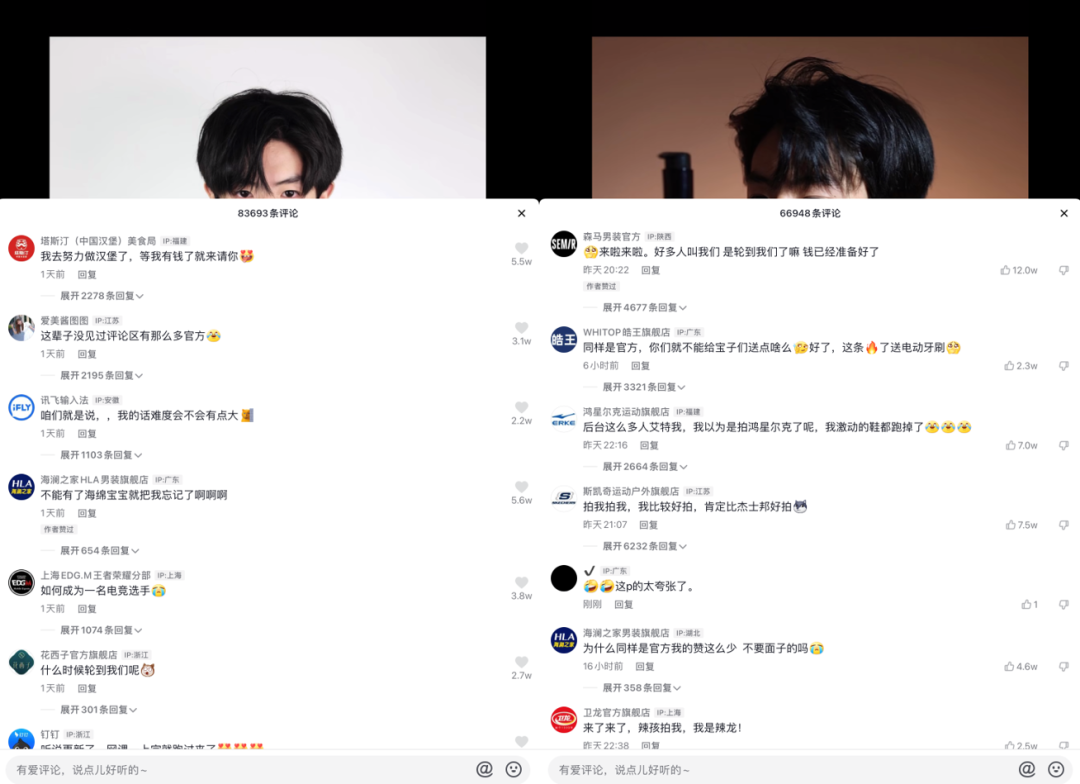 從“品牌代言人”系列第一條視頻更新之后,視頻高贊評論中便集結了諸多品牌方的身影,特步、回力、Dickies、太平鳥、巴拉巴拉、白象、鴻星爾克、金典、森馬、蜜雪冰城……品牌方幾乎已將評論區(qū)淹沒,偶爾擠上來的路人評論也是“這輩子沒見過評論區(qū)有那么多官方”。最“卷”的時候,鴻星爾克的一條評論發(fā)布于凌晨三點。
