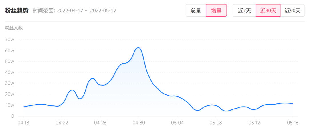 巨量星圖數(shù)據(jù)顯示,“國際超模”系列的視頻播放量大多都在4000萬以上,其中拍攝YSL的那一期播放量最高,達到近8800萬次。反映到粉絲增長曲線上,墊底辣孩的粉絲高速增長期出現(xiàn)在4月下旬,也就是“國際超模”系列期間,而增長峰值便出現(xiàn)在“YSL變裝”視頻之后。