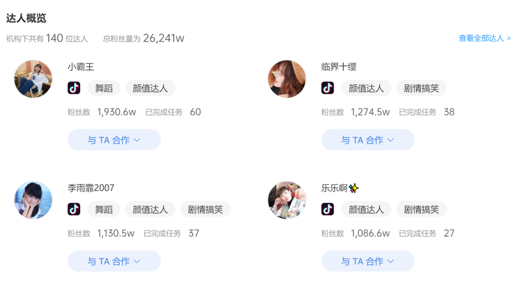 從多種風格嘗試,到后來成系列的爆款輸出,墊底辣孩爆火背后,很難說沒有推手。從其在巨量星圖的公開信息來看,墊底辣孩簽約的MCN機構為看看世界,該機構旗下有140為簽約達人,累計粉絲量在2.6億以上。