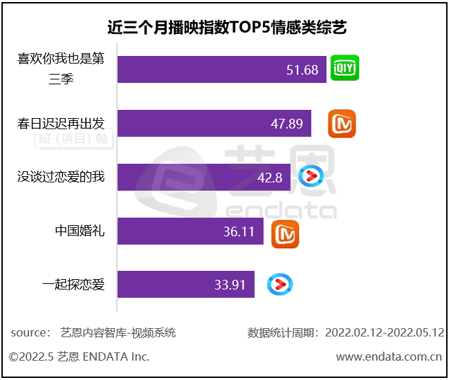 根據(jù)藝恩數(shù)據(jù),2021年上線綜藝中,情感類綜藝的數(shù)量及播映指數(shù)均呈上升,2022年Q1播映指數(shù)TOP10中,素人綜藝占據(jù)4席位。