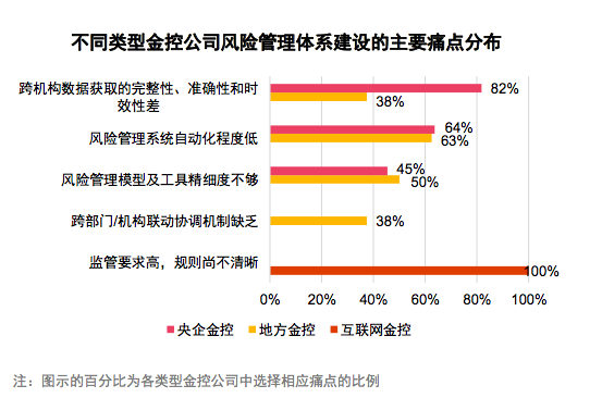具體來看,對于央企金控來說,主要痛點有:跨機(jī)構(gòu)數(shù)據(jù)獲取的完整性、準(zhǔn)確性和時效性差,風(fēng)險管理系統(tǒng)自動化程度低,風(fēng)險管理模型及工具精細(xì)度不夠。對于地方金控來說,主要痛點在央企金控的基礎(chǔ)上還要再加上:跨部門/機(jī)構(gòu)聯(lián)動協(xié)調(diào)機(jī)制缺乏。對于互聯(lián)網(wǎng)金控來說,主要痛點為監(jiān)管要求高,規(guī)則尚不清晰。