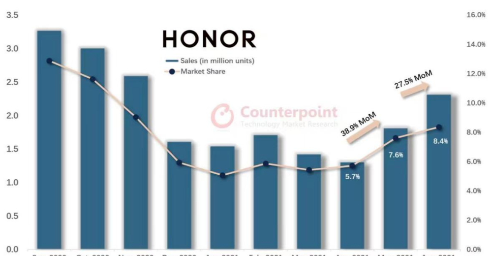 2021年第二季度榮耀業(yè)績(jī)開始回暖 圖源:Counterpoint