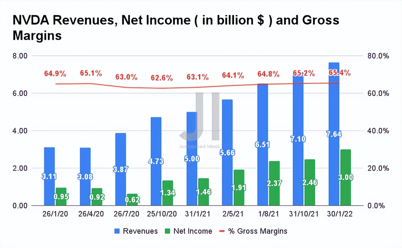 流感大流行前,NVDA 的收入和凈收入以16.44% 和18.9% 的穩(wěn)定復(fù)合年增長率增長。在過去的兩年里,由于在2019冠狀病毒疾病流感大流行期間增加了遠(yuǎn)程工作/學(xué)習(xí)/娛樂的選擇,對個人設(shè)備的需求大量增加,這個數(shù)字顯然呈指數(shù)增長。