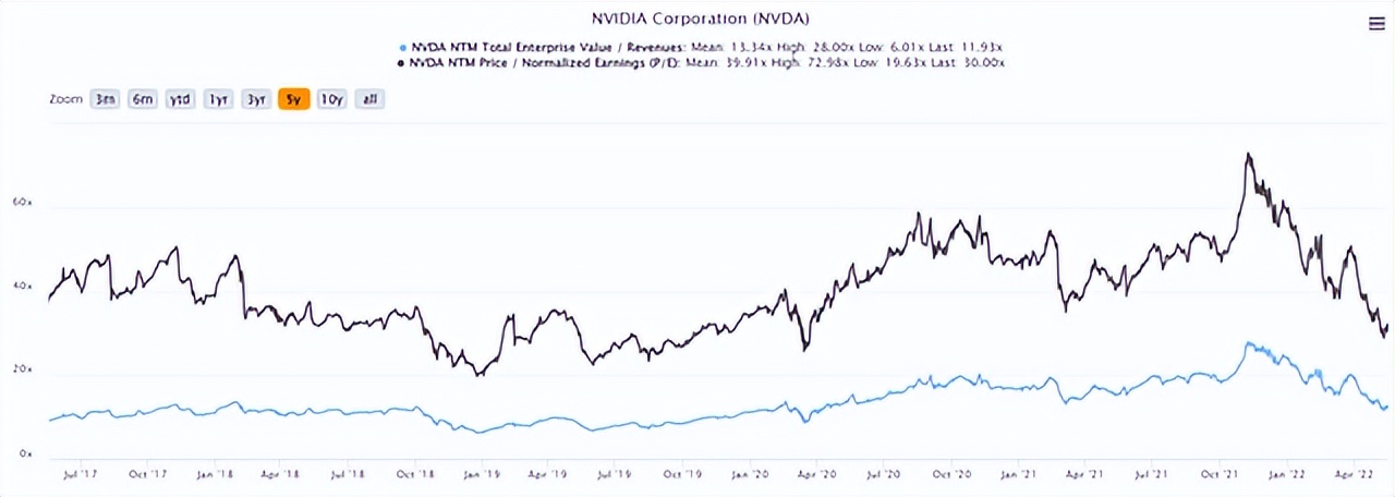 NVDA 5Y EV/收入及市盈率估值