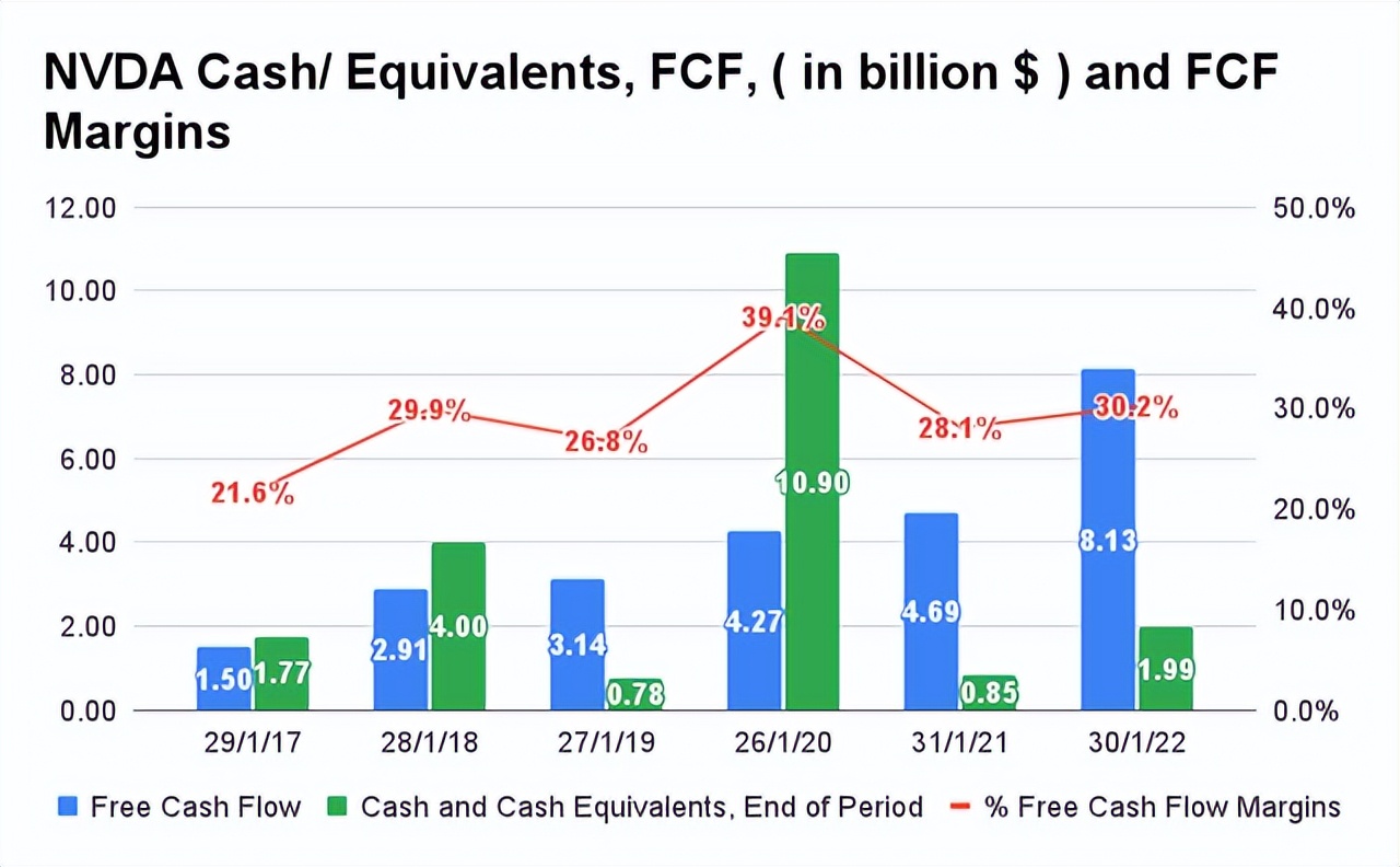 NVDA 現(xiàn)金/等價物,自由現(xiàn)金流量和自由現(xiàn)金流量保證金