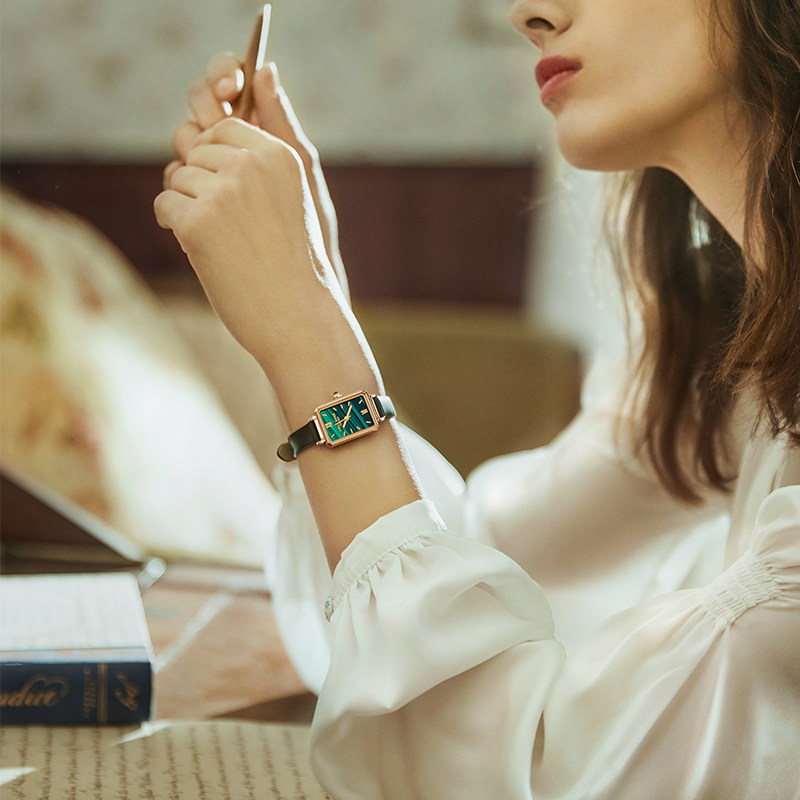 在產(chǎn)品設(shè)計上,Lola Rose以英倫復(fù)古風作為顯性表達。例如其采用皮質(zhì)表帶,表盤采用祖母綠寶石、漸變白色云母等天然材質(zhì),這與市面上常見的鋼表和簡約設(shè)計表盤有著強烈的區(qū)隔。