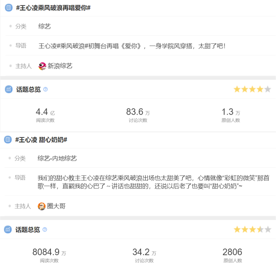 以王心凌為圓心,以《愛你》為半徑,過去她主演的電視劇、演唱主題曲、演唱會的考古舞臺,甚至電視劇另一主演張棟梁都全面翻紅,#你一票我一票 心凌80還唱跳#、#劉畊宏女孩王心凌男孩#等話題也迅速火爆出圈;在芒果TV,王心凌《愛你》純享版舞臺的點贊量4.6萬,數(shù)十倍于其他姐姐千量級的點贊量。