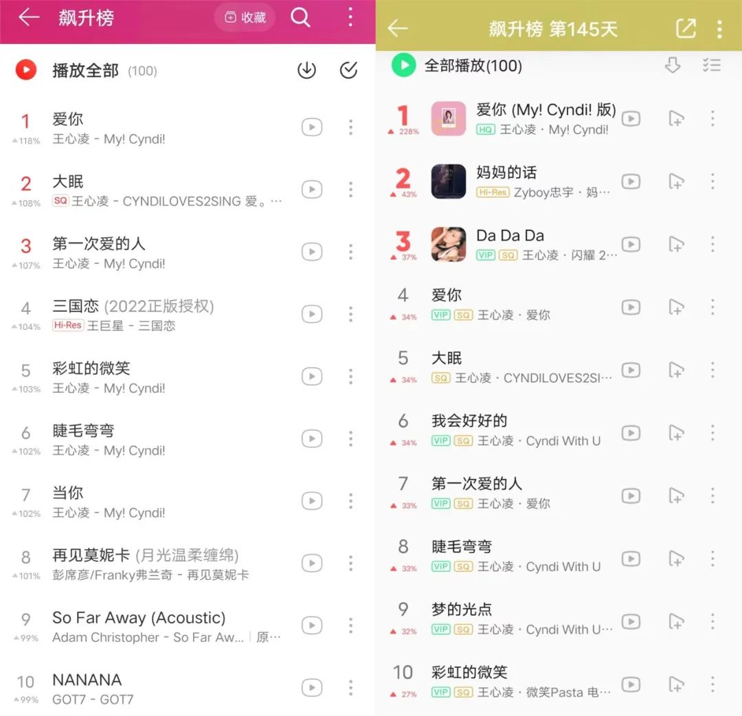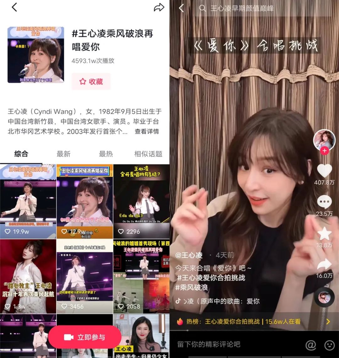 在短視頻平臺,抖音上#王心凌乘風(fēng)破浪再唱愛你#話題轉(zhuǎn)天5月21日便空降熱榜第一,截至5月25日話題相關(guān)視頻的播放量已超4551萬;在QQ音樂上,飆升榜、流行指數(shù)榜上的前10名,王心凌的歌曲均占9席位,在網(wǎng)易云音樂上,《愛你》高居熱歌榜榜首,《愛你》、《大眠》、《第一次愛的人》三首歌攻下飆升榜的前三甲。