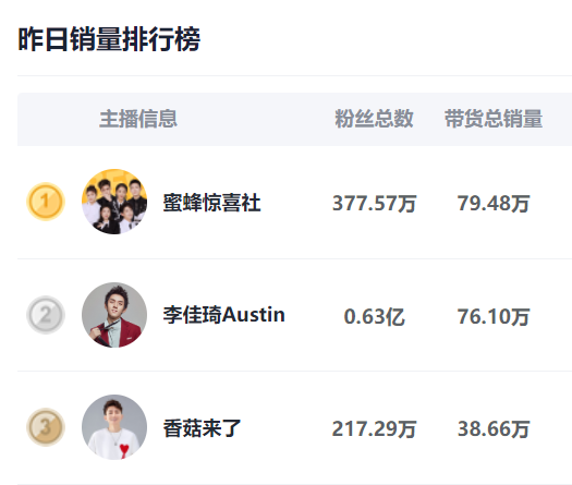 截止發(fā)稿前,當(dāng)前,蜜蜂驚喜社的粉絲量為377萬(wàn),香菇來(lái)了的粉絲量為217萬(wàn),雖然體量遠(yuǎn)不及此前薇婭和雪梨的千萬(wàn)級(jí)流量,但是銷(xiāo)量卻不容忽視的優(yōu)秀,本月以來(lái),蜜蜂驚喜社更是以單日79萬(wàn)銷(xiāo)售量超過(guò)了李佳琦。