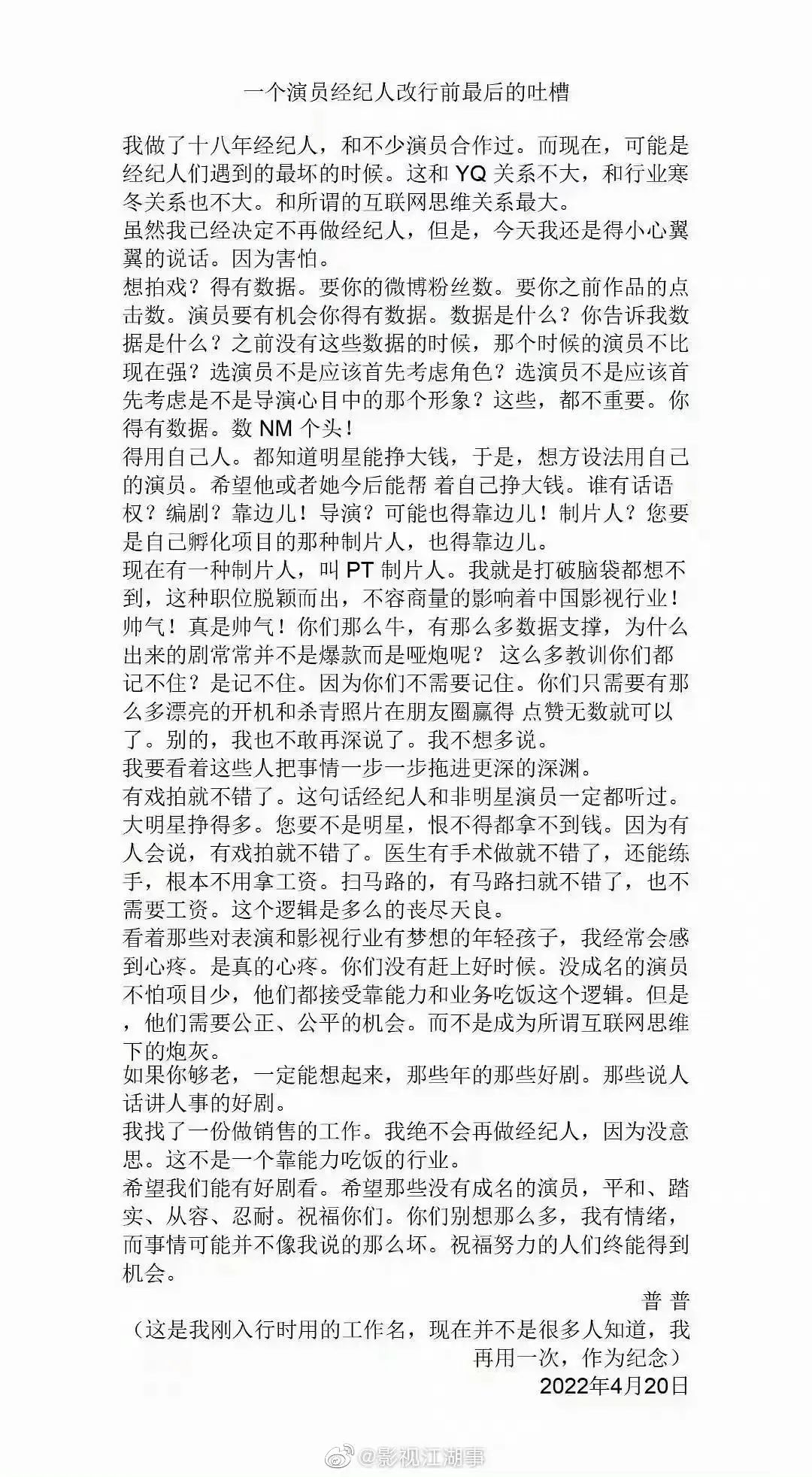 然而娛樂(lè)圈從好劇頻生變成數(shù)據(jù)、流量為上也不過(guò)短短十余年,前不久一封《一個(gè)演員經(jīng)紀(jì)人轉(zhuǎn)行前最后的吐槽》在業(yè)內(nèi)流傳,控訴數(shù)據(jù)、流量大行其道,聲稱(chēng)“這不是一個(gè)靠能力吃飯的行業(yè)”。加之近些年明星頻頻出事爆雷,爆雷后大眾最關(guān)心背后的資本是誰(shuí),資本最關(guān)心如何及時(shí)止損。娛樂(lè)圈中,資本到底扮演了一個(gè)什么樣的角色?