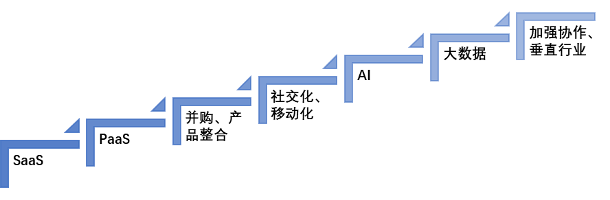 一直以來,Salesforce圍繞CRM這一主體不斷深化,如果將Salesforce的成長經(jīng)歷比喻成多級(jí)跳躍,那么從引入執(zhí)行SaaS這個(gè)概念的時(shí)候,它就已經(jīng)完成了第一級(jí)?;仡橲alesforce20余年的歷史,2010年之前主要是內(nèi)生發(fā)展期,2011年后,Salesforce開啟外延并購?fù)卣?,由并購及自然滲透雙重疊加,讓它的CAGR保持在20%-40%的增長,過渡到2015后,增長率保持在20%-30%之間,逐漸趨于成熟。