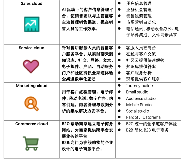 圖:Salesforce核心Saas產(chǎn)品功能(新眸制圖)