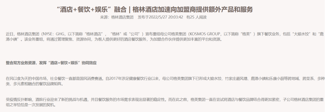 根據(jù)公開信息顯示,格林將在重組后一站式整合旗下近6000家酒店(含籌建)與餐廳餐飲等資源,不僅能廣泛合理運用各地區(qū)人才庫與管理運營經(jīng)驗,增加“跨界”合作機(jī)會;也能提供更專業(yè)、更廣闊、更全面的發(fā)展空間,利用自身供應(yīng)鏈優(yōu)勢,成功打通“酒店+餐飲+娛樂”全產(chǎn)業(yè)鏈通道。