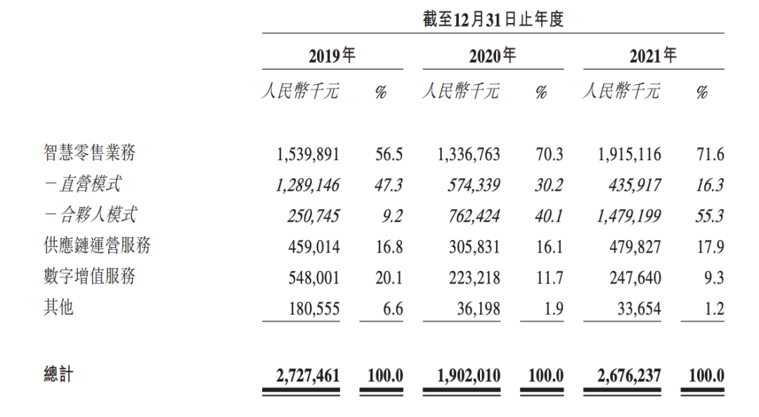 智慧零售業(yè)務即無人售貨機業(yè)務。2019年、2020年及2021年,該業(yè)務取得營收15.4億元、13.4億元和19.2億元,占總營收的比例分別為56.5%、70.3%及71.6%。比較特別的是,該業(yè)務有兩種經(jīng)營模式:直營模式和合伙人模式。