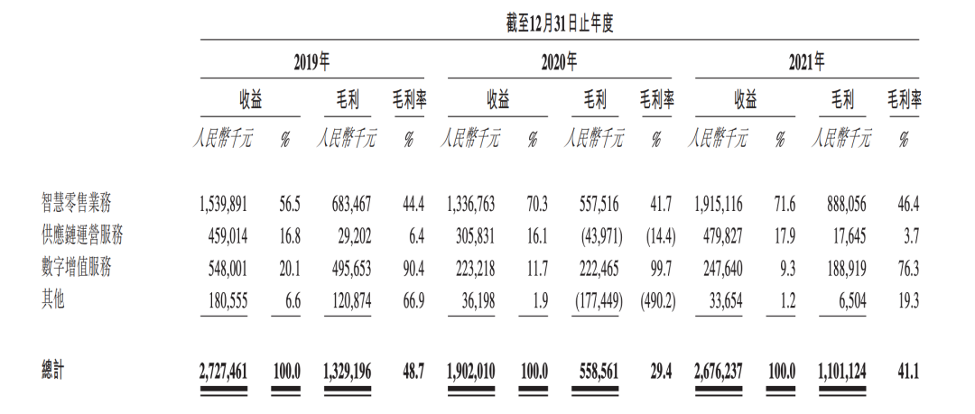 友寶的業(yè)務組成并不復雜。招股書顯示,公司目前擁有智慧零售、供應鏈運營、數(shù)字增值以及“其他”四塊業(yè)務。其中,智慧零售業(yè)務是友寶的營收主力。