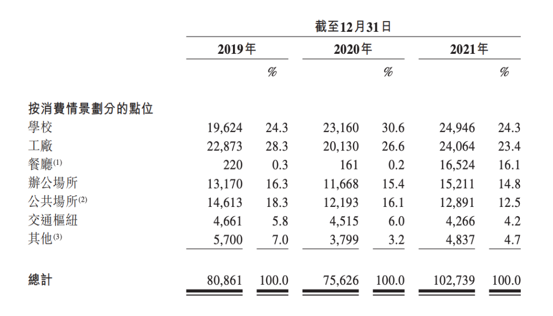 招股書顯示,友寶一半左右的點位位于學校和工廠,三成點位在辦公場所和公共場所(主要是景點、公園、醫(yī)院、購物中心)。2021年,友寶加強與餐廳的合作,餐廳點位數(shù)量明顯增加。