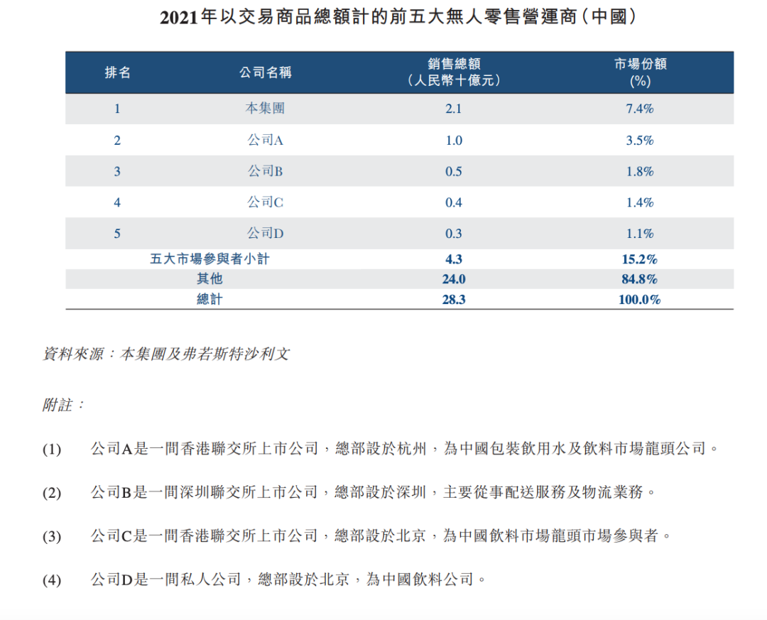 根據(jù)招股書中的描述,友寶是國內(nèi)第一大無人零售營運商,排在第二和第三位的公司A和公司B應為農(nóng)夫山泉和順豐。相比已經(jīng)成熟的技術,無人售貨機生意的門檻更在于采購議價權、供應鏈管理、渠道拓展、倉儲物流能力,而作為大玩家的農(nóng)夫山泉和順豐不會缺少競爭資源。