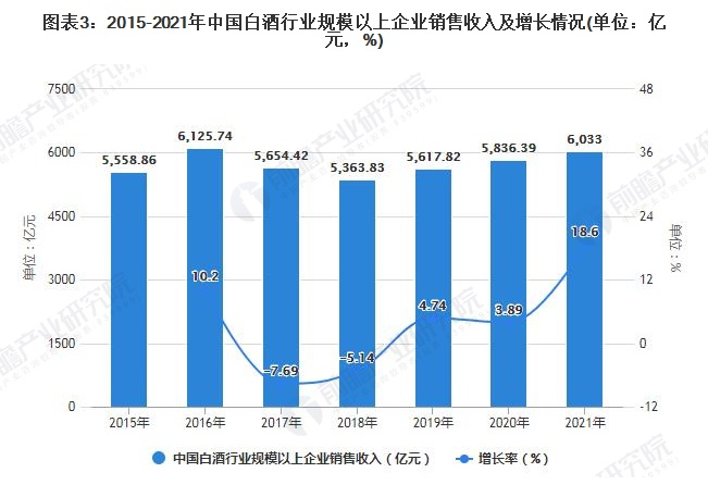 2021年,中國白酒行業(yè)發(fā)展快速,成為疫情下的市場熱點。行業(yè)規(guī)模以上企業(yè)銷售收入完成6033億元,與2020年相比增長將近200億元,累計增長率也達到18.6%,穩(wěn)中向好。