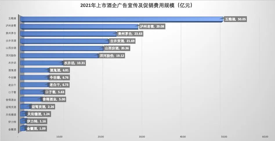 白酒行業(yè)營收增長離不開廣告,2021年,五糧液、貴州茅臺等十六家上市白酒企業(yè)共支出廣告宣傳及促銷費用210.93億元,占銷售費用的69.15%,廣告費用普遍是各企業(yè)銷售費用的最大支出。