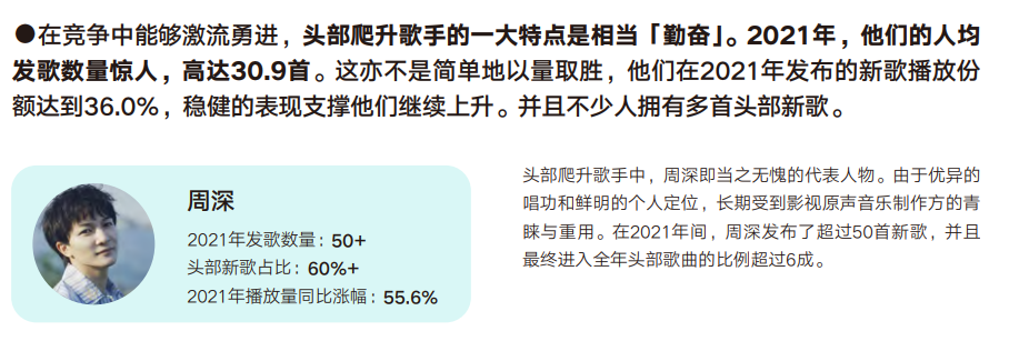 缺點(diǎn)則是市場(chǎng)容易趨于保守,重復(fù)使用歌手。周深上次出原創(chuàng)專輯還是2019年,但據(jù)騰訊音樂數(shù)據(jù)研究院統(tǒng)計(jì),周深2021年一共出了50+首歌,其中多為影視作品OST。這也并非是這幾年的特色,而是市場(chǎng)化后的必然,韓磊團(tuán)隊(duì)就曾打算在2014年申報(bào)吉尼斯世界記錄,因?yàn)轫n磊到當(dāng)年為止,已經(jīng)唱過七百多首影視劇和專題片的曲目。