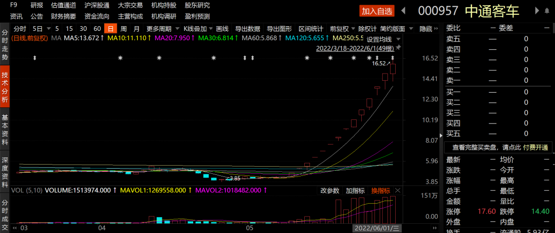 5月5日至6月1日,中通客車股價從最低4.10元一路狂飆至最高16.52元,漲幅達284.62%,股價幾乎翻了4倍。在5月13日至5月31日的13個交易日里,中通客車更是收獲連續(xù)13個漲停。
