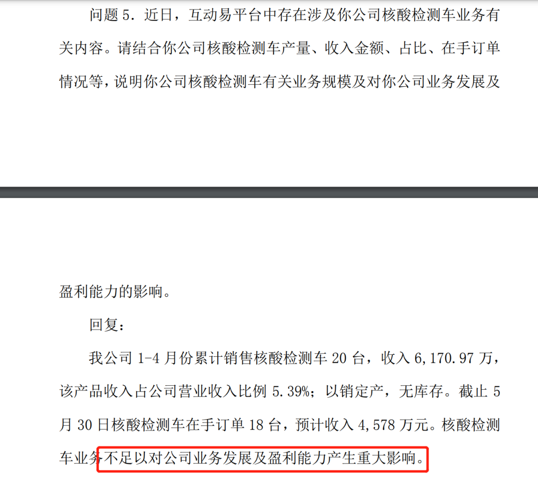 魔幻的是,被外界普遍視作本輪股價狂飆原因的中通客車核酸檢測車,銷量卻遠不如股價來得火爆。據(jù)中通客車發(fā)布的公告顯示,公司1-4月累計銷售核酸檢測車20輛,收入為6170.97萬元,占公司營業(yè)收入比例為5.39%;截至5月30日,核酸檢測車在手訂單數(shù)為18輛,預(yù)計收入為4578萬元。