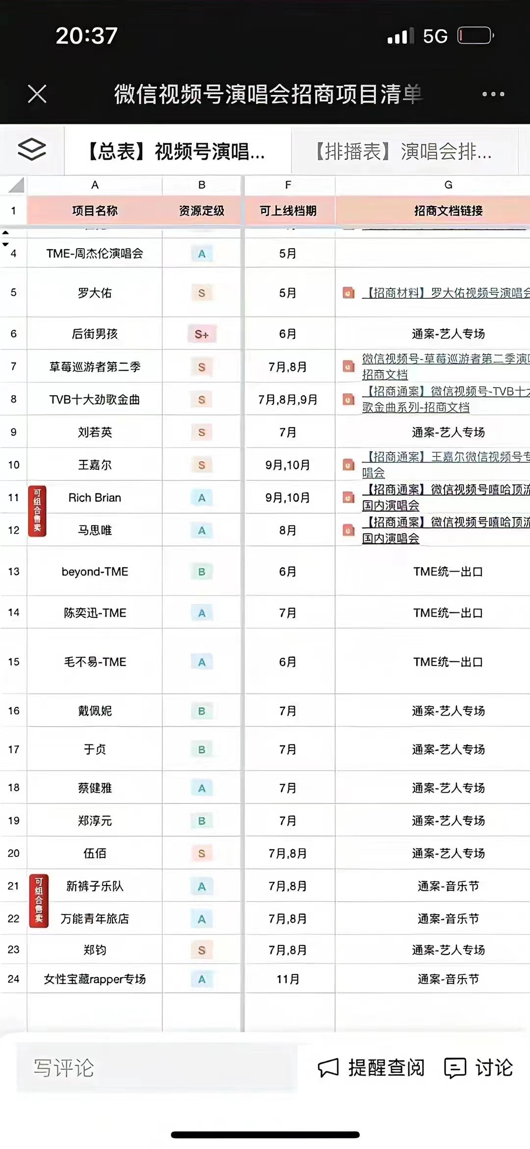 不僅籌備618電商節(jié),微信將逐漸打法成型的視頻號(hào)演唱會(huì)模式,也在緊鑼密鼓地推廣起來。從網(wǎng)傳的微信視頻號(hào)演唱會(huì)招商項(xiàng)目清單中,可以看到6-8月還有后街男孩、劉若英、伍佰等明星演出活動(dòng)安排。